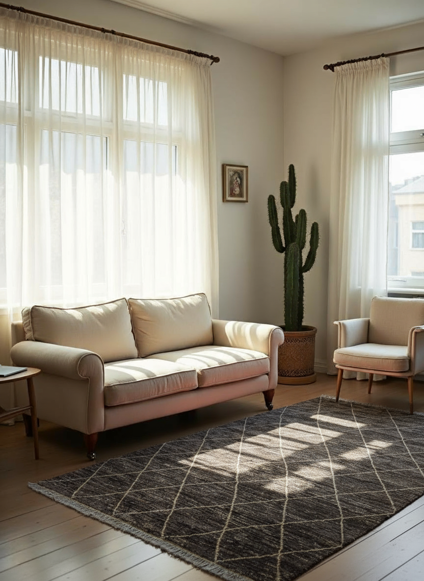 • The rug's colors and patterns shift dramatically with your perspective, coming alive in rich vibrancy when the fibers face you, softening to subtle elegance as they turn away. This inherent interplay is not a flaw, but an elevating quality that renders the rug an interactive work of art.