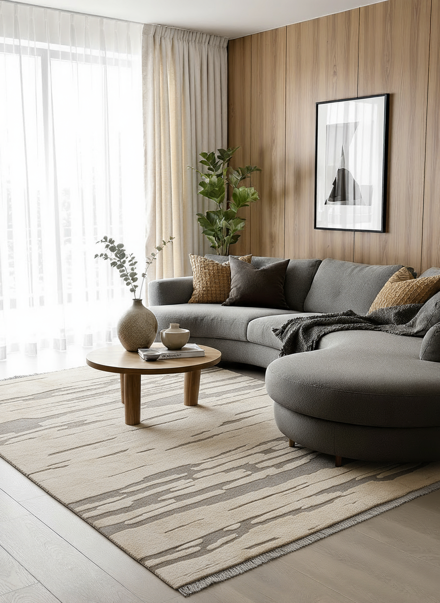 Handmade rugs by Ahsan Imam in natural and neutral tones, capturing the serene beauty of earthy desert landscapes.
