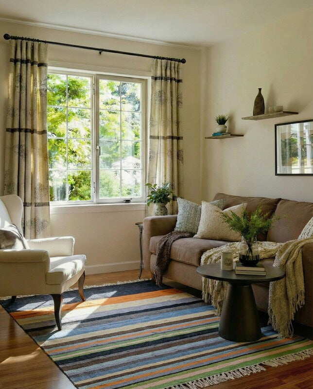 • The rug's colors and patterns shift dramatically with your perspective, coming alive in rich vibrancy when the fibers face you, softening to subtle elegance as they turn away. This inherent interplay is not a flaw, but an elevating quality that renders the rug an interactive work of art.