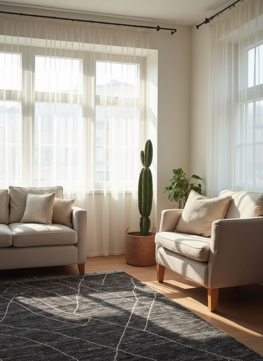 Handmade rugs by Ahsan Imam in natural and neutral tones, capturing the serene beauty of earthy desert landscapes.